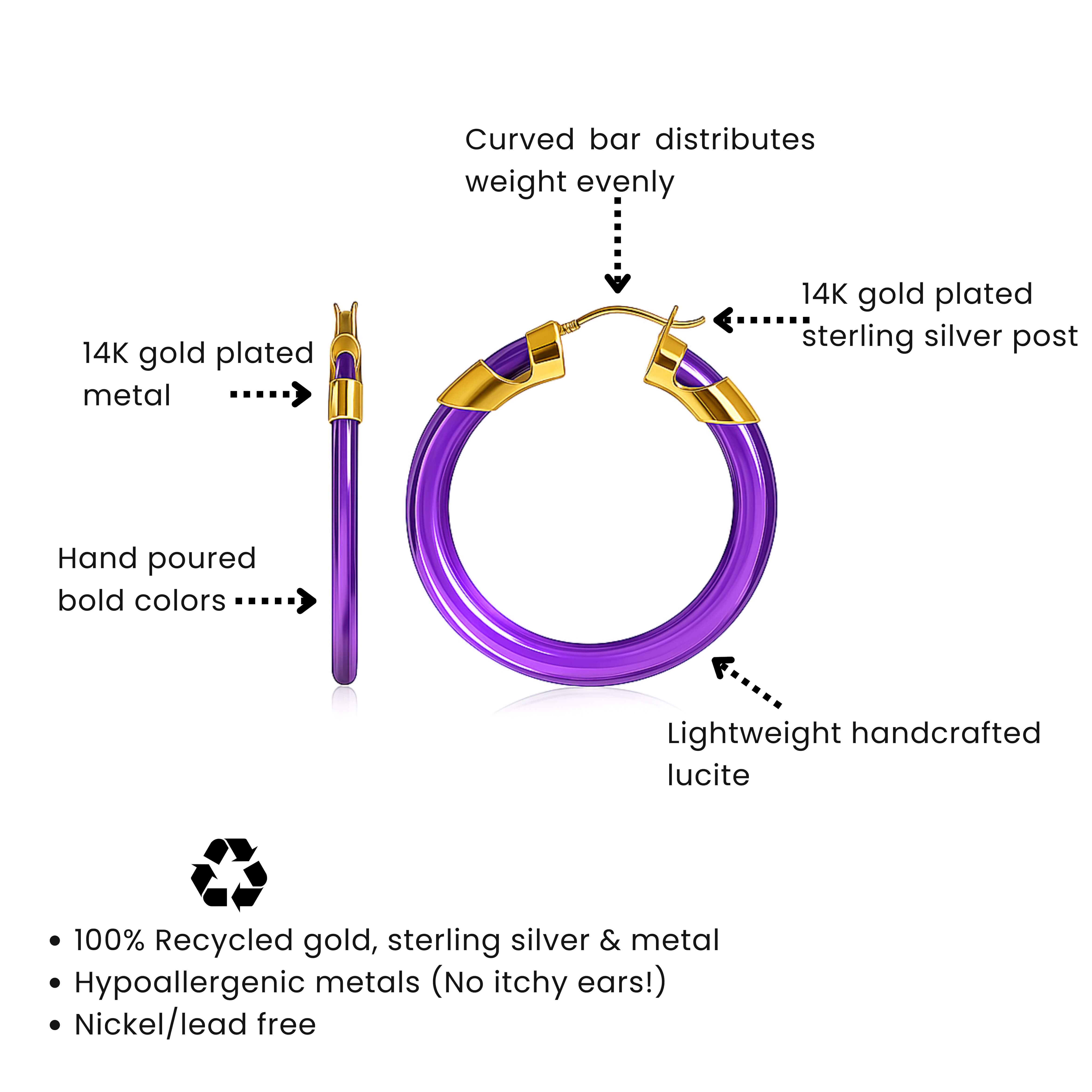 Make it timeless, make it chic! Our Classic Flat Lucite Hoops show off gemstone colors in the most vibrant way. 12 birthstone shades, one lightweight and easy statement.